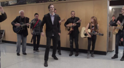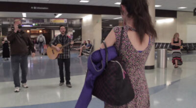 Hemos visto películas hechas para pedir matrimonio, restaurantes vacíos preparados para una cena romántica o pedidas de mano en los lugares más recónditos del mundo… Ahora, un joven estadounidense se ha decidido por declararse a su chica cuando ella regresaba de un viaje. Un tour por los diferentes pasillos del aeropuerto y en cada parada una canción escrita para ella e interpretada por los amigos músicos de ambos.