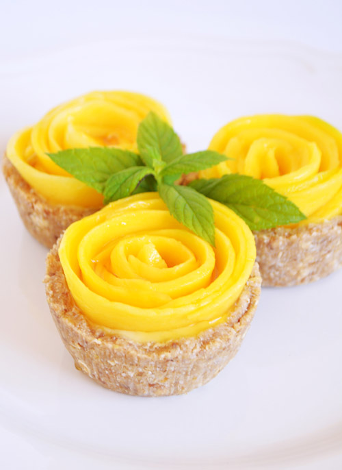 Ingredientes (para 5 o 6 raciones):Para la base:12 dátiles naturales y una cucharada de agua160 g de avena40 g de coco rallado deshidratado y sin azúcar añadidoPara el relleno:250 g de mango maduro100 ml de leche evaporada100 ml de yogur natural o friego sin azúcar3 hojas de gelatina neutraMedia cucharadita de estevia blanca en polvoDecoración:Un mango maduroModo de elaboración:Para empezar, pon todos los ingredientes utilizados para la base en la licuadora y mézclalos hasta que obtengas una pasta de consistencia pegajosa y moldeable. Después, rellena con esta masa cada uno de los moldes individuales de aluminio que utilizaremos. Aplástalos y dale forma de canasta con los dedos ligeramente húmedos. Guárdalos en la nevera mientras preparas el relleno.Para elaborar el relleno, primero ponemos a hidratar las láminas de gelatina en un cuenco con agua fría. Cuando las tengamos listas, vamos a calentar la leche evaporada y diluimos en ella las hojas de gelatina. A continuación, mezcla con la batidora la leche y la gelatina con el resto de ingredientes del relleno hasta que obtengas una especie de crema sin grumos. Después, vierte esta crema de mango en las tartaletas que hemos preparado anteriormente y guárdalo en el congelador mientras preparamos la decoración.Para poner el broche de oro a este postre, nada mejor que utilizar más mango. Para ello, pela y corta el mango en tiras muy finas. A continuación, saca las tartaletas del congelador y comienza a decorarlas desde el centro, de tal manera que vayas creando la rosa tal y como aparece en la fotografía.Una vez que esté decorada, dejamos las tartaletas en la nevera durante dos horas y las servimos bien frías. Si quieres presentar un postre de 10 a tus invitados, rocíalas con miel para darles un toque de brillo.