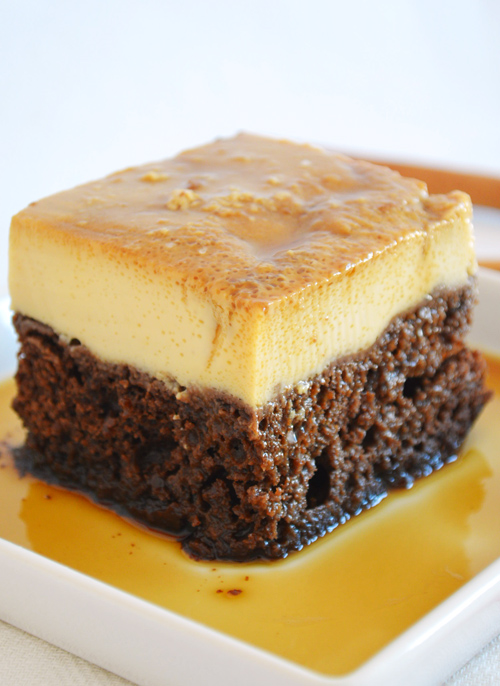 Ingredientes (para 8 raciones):Para el bizcocho de chocolate:3 huevos4 cucharadas de panela molida o azúcar de coco70 g de harina de arroz50 g de almendras molidas3/4 de cucharadita de estevia3 cucharadas de cacao en polvo desgrasado y sin azúcar añadido10 g de levaduraUna pizca de sal del HimalayaPara el flan:Un huevo y 3 claras400 ml de leche desnatada o vegetal de almendras o de coco y arrozUna cucharadita de vainillaMedia cucharadita de estevia blanca en polvo y 3 cucharadas de panela molidaPara el caramelo:3 cucharadas de panela molida y 1,5 cucharadas de aguaModo de elaboración:Lo primero será preparar el bizcocho. Mezcla los huevos y la panela hasta lograr una consistencia homogénea. Puedes hacerlo con la ayuda de una batidora eléctrica para incorporar un poco de aire a la mezcla. En un recipiente aparte, mezcla los ingredientes secos y pásalos por el tamizador antes de añadirlos a los líquidos. Remueve hasta que no queden grupos y reserva.A continuación, pon en un recipiente la leche, la panela, la estevia y la vainilla y mézclalo bien hasta que la panela se haya disuelto por completo. Agrega también los huevos y las claras y mezcla un poco más hasta que todo esté integrado. Reserva.Para elaborar el caramelo, pon la panela con el agua en una sartén y caliéntalo a fuego bajo hasta que el agua se reduzca y quede una especie de miel espesa. Es indispensable que viertas el caramelo enseguida en un molde para que no se endurezca.Tras esto, coloca la masa del bizcocho sobre la base de caramelo y después agrega la mezcla del flan. Tapa inmediatamente el molde con papel de aluminio y mételo en el horno al baño María. Para ello, mete el molde dentro de una bandeja con agua. Mantenlo en el horno durante unos 30 o 40 minutos a 200º y, para comprobar que está listo, pínchalo con un palillo para comprobar que sale seco.