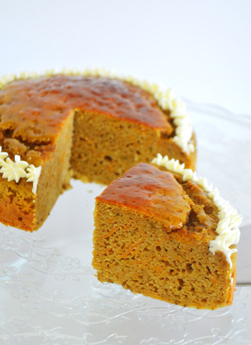 Ingredientes (para 6 raciones):Líquidos:3 huevos4 cucharadas de panela100 g de calabaza ralladaSecos:70 g de harina de arroz integral60 g de avellanas molidas3/4 de cucharadita de estevia en polvo1/4 de cucharadita de mezcla de cuatro especias10 g de levaduraUna pizca de sal del Himalaya.Modo de elaboración:Para empezar, pon el molde (de aproximadamente 16 cm de diámetro) a precalentar a 180º con calor arriba y abajo y cúbrelo con papel vegetal. Después, con la ayuda de unas varillas eléctricas, mezcla en un bol los huevos y el azúcar hasta conseguir una consistencia homogénea.En un bol aparte, mezcla la harina de arroz, la harina de avellanas, la estevia en polvo, las especias y la levadura. Ve incorporando la mezcla de ingredientes secos a la de ingredientes secos hasta conseguir una masa sin grumos. En este punto, incorpora la calabaza rallada y continúa mezclando.Cuando lo tengamos listo, pon la masa en el molde y llévalo al horno a 180º. Para saber si está bien cocido, puedes hacer la prueba del palillo. A la hora de servirlo, puedes decorarlo con una crema ligera de queso crema light y estevia.