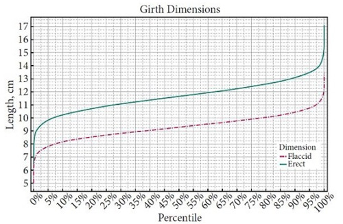 Por último, la investigación aporta una segunda gráfica, en este caso, en cuanto a la circunferencia media del pene, es decir, su anchura o grosor. Se establece aquí que lo normal es un promedio de 9,31 cm para un pene flácido y 11,66 cm para uno erecto.