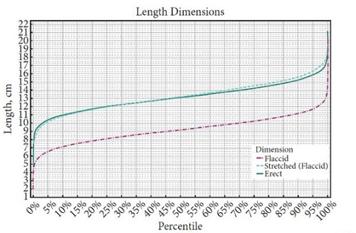 Según las gráficas de este estudio, la longitud media de un pene en erección es de 13,12 centímetros, mientras que un pene flácido o en reposo mide 9,16 centímetros de media. Curiosamente, también revelan qué se considera normal en un pene flácido estirado: 13,24 centímetros.