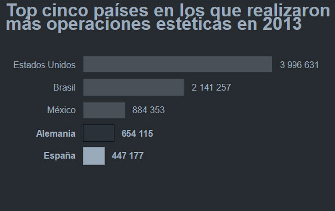 En 2013, las operaciones estéticas, sumando ambos géneros, alcanzaron los 20 millones en los 95 países estudiados por el ISAPS. Las mujeres seguimos estando a la cabeza de esta lista, representando más del 85% del total. EEUU es el país que más intervenciones se realiza, llegando a ostentar el 17% de los 20 millones de operaciones registradas. Tras ellos llega Brasil (9.1%), México (3.8%), Alemania (2.8%) y, en quinto lugar, España (1.9%), como vemos en el gráfico de la derecha.