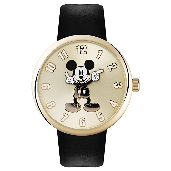 Un reloj de cuarzo de Mickey unisex elegante y divertido para lucir en tu día a dá. Con la esfera dorada y correa en piel de color negro.