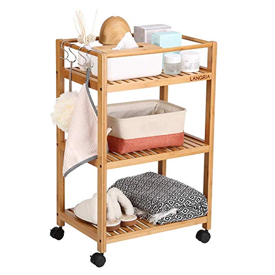 Para el baño, para la cocina e incluso para el dormitorio, este carrito auxiliar en madera pega con casi cualquier decoración y te hará conseguir más espacio para colocar cosméticos, toallas o botes de alimentos. Posee una capacidad de carga de 5kg/balda y 2 de las 4 ruedas tienen frenos para mantener el carro fijo, súper práctico. Tiene unas medidas de 76 x 37 x 13 cm.