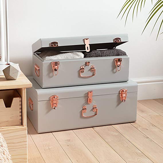 Estos baúles estilo vintage sirven para decorar tu dormitorio o salón a la vez que te permiten almacenar cosas. Son una opción perfecta para ordenar y guardar productos que no utilizas a menudo pero que no quieres tirar, juguetes viejos, zapatos o cosas de los bebés. Puedes cerrar los baúles completamente, haciendo que todo lo que guardes quede fuera de la vista. Son muy elegantes y pueden servir incluso como mesita de noche. El baúl más grande tiene 60 x 36 x 24cm y el más pequeño 52 x 26 x 20cm. Puedes apilarlos uno sobre el otro y quedarán genial. Están disponibles en varios colores, elige el que mejor combine con la decoración de tu hogar.