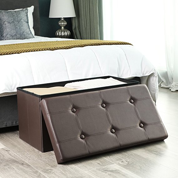 Otra opción que sirve para almacenar cosas que no quieres tener a la vista y que a la vez decora y, en este caso, también sirve como asiento. Este baúl es estable y robusto gracias a su estructura hecha de tablero MDF de clase E1, sólida y duradera. La cubierta está hecha de cuero sintético y relleno de esponja gruesa, suave y cómoda. Sus medidas son 76 x 38 x 38 cm.