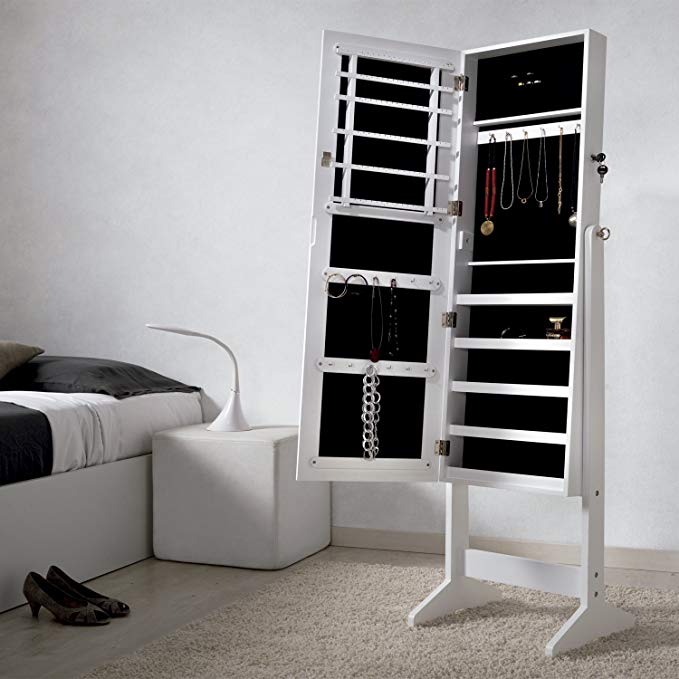 Nuestra última recomendación de la lista es este espejo con joyero que te va a conquistar. Este espejo se abre y guarda un organizador donde podrás organizar todas tus joyas, e incluso tu maquillaje. Es una de nuestras opciones preferidas para ahorrar espacio. Tiene unas medidas de 120 cm x 37 cm con el marco, mientras que las del joyero interior son 160 cm (alto) x 41 cm (ancho) x 36 cm (fondo). El joyero incluye llave y cerradura para mantener todo lejos del alcance de cualquiera que no seas tú.