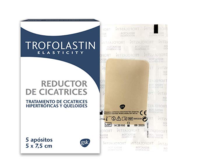 Trofolastín – Apósitos reductores de cicatrices: quizé el producto más conocido y utilizado para cuidar y reducir cicatrices. Estos apósitos de poliuretano tiene dos funciones principales, protegen la cicatriz de los rayos del sol y, por otro lado, tiene un poder hidratante que favorece la regeneración. Los apósitos pueden utilizarse para la reducción de cicatrices hipertróficas recientes, o antiguas, o queloides. Pega el parche sobre la cicatriz, puede durar sobre la piel alrededor de 7 días. Puedes comprarlo en Amazon por 26,07€.