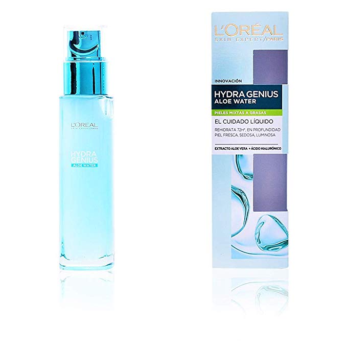 L’Oreal Paris Dermo Expertise Hydra Genius Aloe Water: hidratante en textura en gel, sin aceites, perfecto para pieles mixtas, ya que evita los brillos y el exceso de grasa en la zona T. Contiene aloe vera, esencial para hidratar y regenerar la piel, además de ácido hialurónico, capaz de mantener el agua en las capas más profundas de la piel para evitar la sequedad y evitar el envejecimiento prematuro. Comprar en Amazon por 7,99€.