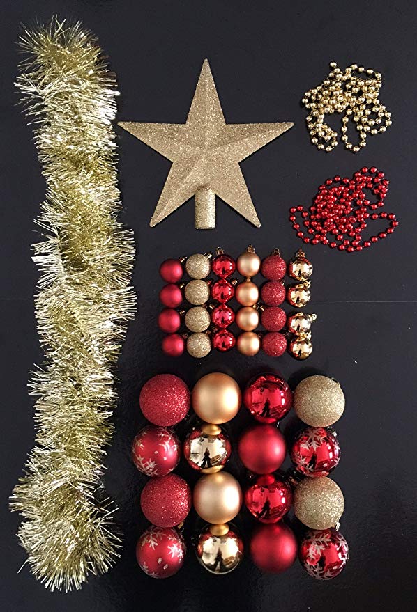 Pack de 44 accesorios para decorar tu árbol en tonos rojos y dorados