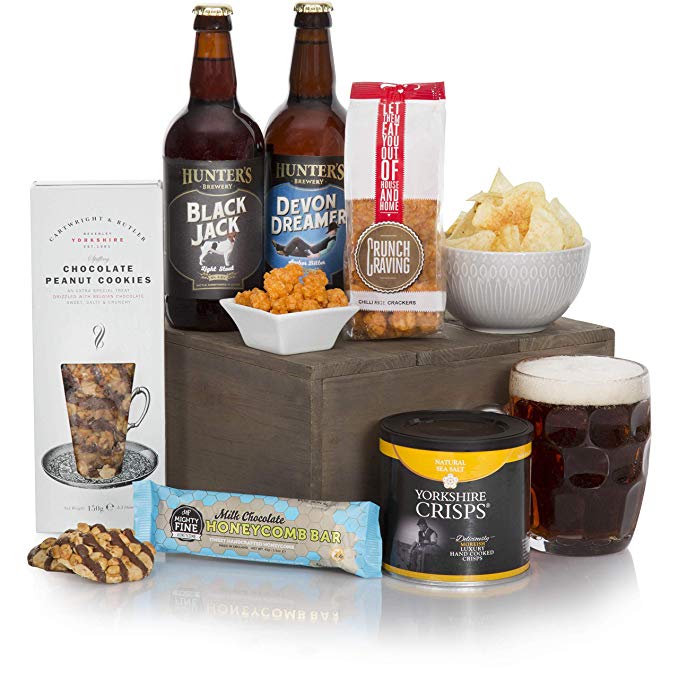 Dos cervezas de medio litro Hunter’s premium artesanas, palitos de pesto, galletas de queso cheddar, patatas con sal marina de Yorkshire, crackers de arroz y guindillas, chocolate peanut cookies, entre otras cosas incluye este fabuloso pack para los más delicatessen.