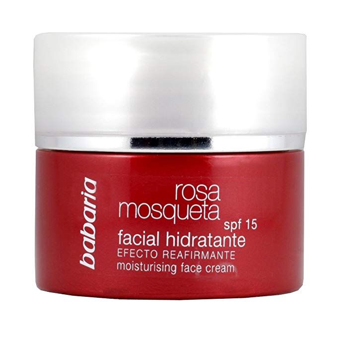 Babaria, crema facial reafirmante de rosa mosqueta: esta crema hidratante ofrece un cuidado muy completo para la piel del rostro de forma diaria. La rosa mosqueta contribuye a que la piel se reafirme y las arrugas se atenúen. Tiene SPF 15 para evitar el fotoenvejecimiento y los daños que los rayos UV provocan en la piel. Su poder hidratante te deja la piel nutrida y lisa hasta 24 horas.