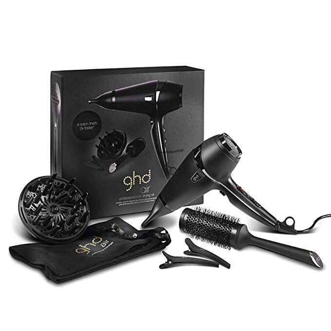 Este kit de GHD, prestigiosa marca en el sector del cuidado del cabello, es una chulada. Incluye: secador del pelo, funda, pinzas para el peinado, cepillo para peinado, boquilla estrecha y difusor.
