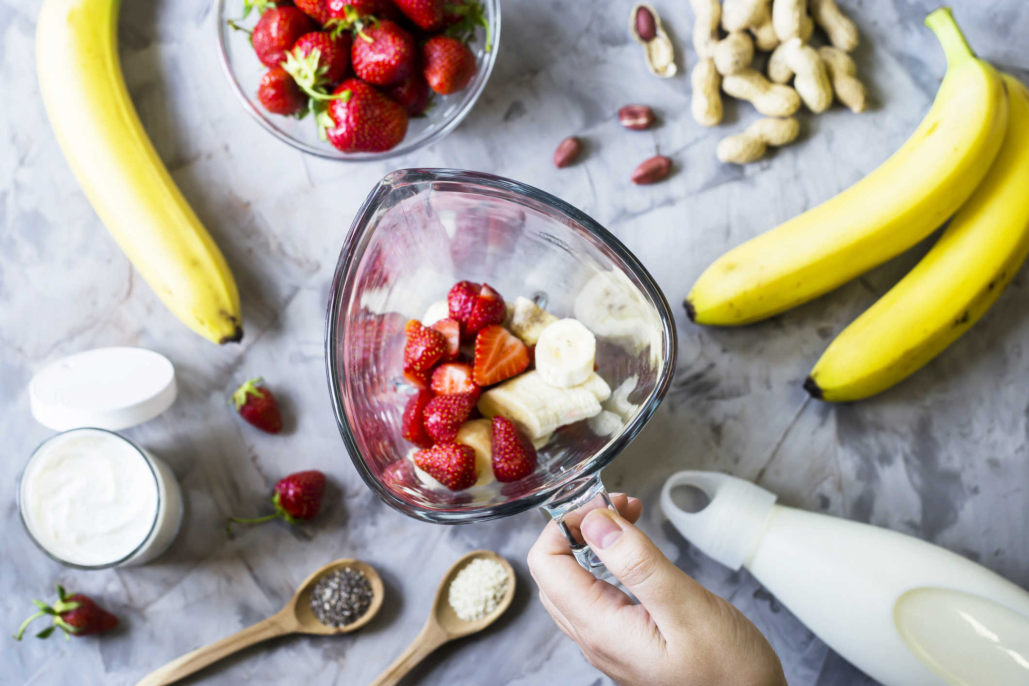 Mezcla en el vaso de la batidora un plátano congelado, 5 o 6 fresas congeladas, una taza de leche (te recomendamos utilizar leche de avena, almendras o coco, así evitarás tener que añadirle azúcar) y 3 cubitos de hielo. Bate todo durante unos minutos a máxima velocidad hasta que quede la textura que quieres y ¡listo!.