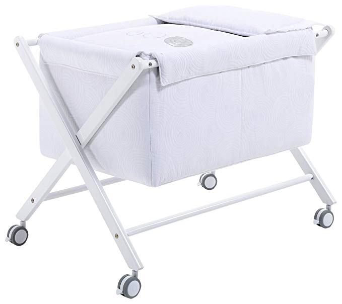 Esta minicuna de Alondra incluye vestidura, colchón, colcha con relleno para verano e invierno y cojín. La minicuna tiene ruedas con frenos para que puedas transportarla con facilidad o dejarla en un sitio fija.