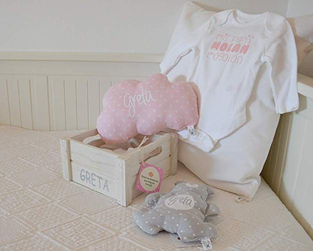 Tiene unas medidas de 36x33x7,5 cm y puedes elegir tanto el tipo de letra con la que bordar el nombre del bebé, como el color que prefieras.