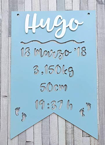Otro detalle encantador para regalar a un bebé recién nacido. Incluye el nombre del bebé, la fecha de nacimiento y la hora y el peso y la medida. El cartel tiene forma de banderín, con unas medidas de 30 cm de largo por 20 de ancho. Puedes elegir el color que prefieres entre 9 diferentes. ES muy sencillo, al realizar la compra escribe los datos que quieres incluir en la placa y ¡listo!
