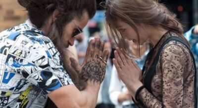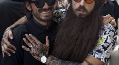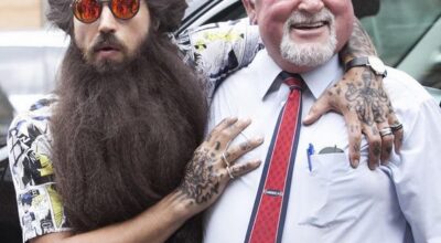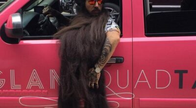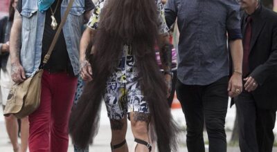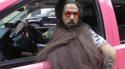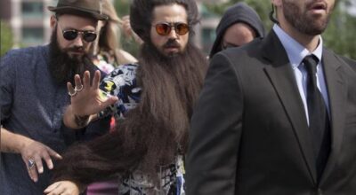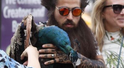 Tan larga y tan frondosa es su barba, que necesita asistentes y guarda espaladas ¿puedes creerlo? 1’5 metros significan mucho pelo, muchos cuidados y un recorte muy preciso. Pero por si su barba no fuera lo suficientemente llamativa, Bayne completa su look con un abultado moño masculino, unas gafas de espejo, ligas, total look estampado, y… ¡Un pavo real! ¿Excentricismo? No lo creas.