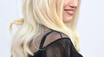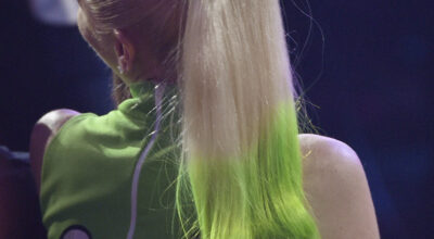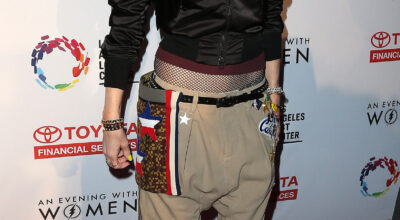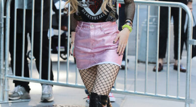 La mezcla de tendencias como las transparencias, los detalles de volantes en los brazos y el calado a modo de rejilla del top es demasiado y provoca un efecto muy recargado. Si lo unimos a la minifalda de palas abotonada, estilo college, y a las medias opacas en blanco, el resultado es este total look que no encaja con el estilo pin up al que estamos acostumbradas a ver a la artista. Como colofón final y guinda del pastel al look, los zapatos negros rompen totalmente la «línea pulcra» del outfit.