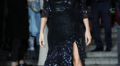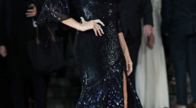 Un diseño negro de strass con escote en V en la espalda y una gran abertura lateral en la falda, que dejaba a la vista unas sencillas sandalias de tacón negras. Para completar el estilismo escogió unos pendientes de diamantes que combinaban a la perfección con el brillo del vestido. En cuanto al look beauty optó por el pelo suelto y un maquillaje muy natural.