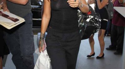 Los looks de Rihanna han pasado de extravagantes a indescriptibles. En esta ocasión la cantante llegaba al aeropuerto de Los Ángeles vestida con un pantalón de deporte negro, camisera de tirantes del mismo color, calcetines blancos y negros y sandalias de pelo, de andar por casa. No sabemos si es que se encontraba durmiendo en casa y decidió viajar sin planearlo o si es que decidió vestirse de esta manera para meterse en la “cama” nada más coger el avión. Lo más normal del mundo.