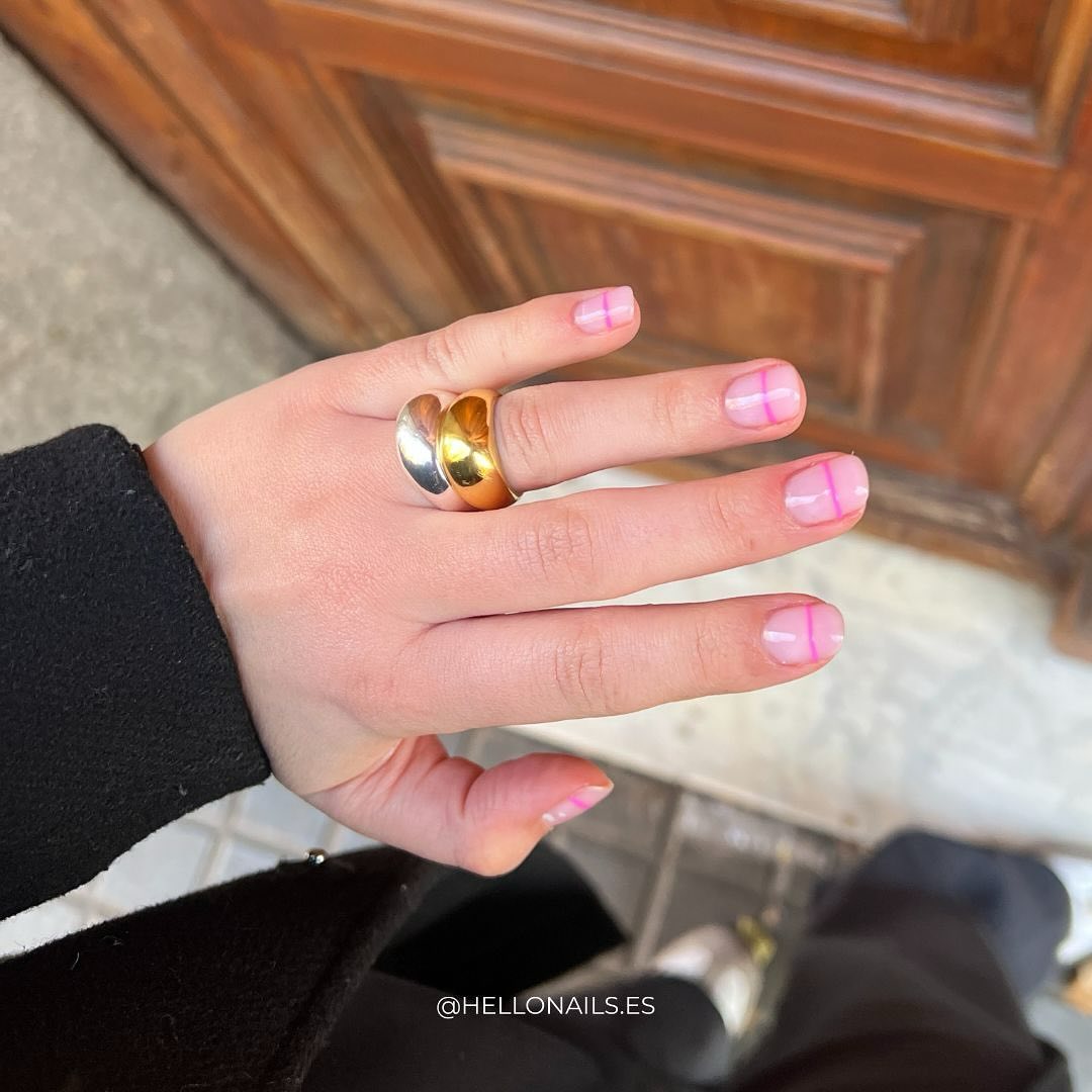Esta otra alternativa tampoco podía faltar en la lista. Los diseños sencillos ahora son tendencia y este con una línea finita en color rosa oscuro sobre la base en rosa pastel nos parece lo más. ¿Qué opinas?