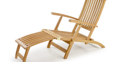 Incluir una tumbona de madera de teca con acabado natural y un banco de madera convertible en mesa para los espacios pequeños. De esta forma, además de descansar al aire libre también podréis organizar comidas y cenas en verano.