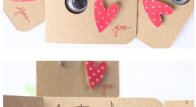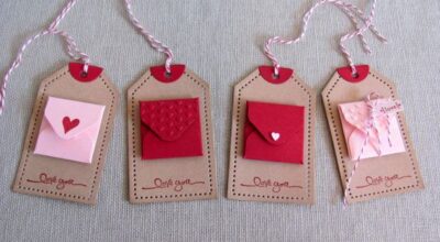 También puedes hacer tus propias tarjetas de felicitación con un poco de cartón y una cuerda, ¿has visto que bien quedan? No te olvides de hacerte con cartulina roja para recortar corazones y personalizarlas con ellos.