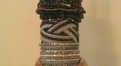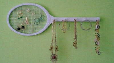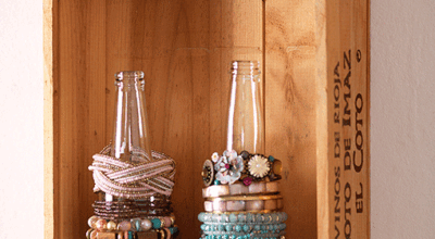 Como ves, las ideas sencillas son las más bonitas. Con cajas de vino recicladas y botellas que ya no usemos podemos crear una estantería en la que colocar todas nuestras pulseras por orden. Para los pendientes, nada mejor que colgarlos de una malla (como la de una raqueta, por ejemplo), así podremos tenerlos todos a la vista de una manera muy práctica.