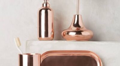 >El cobre puede ser una buena opción para introducir en el baño. Junto con los muebles en color blanco crearán una combinación perfecta. Si además contamos con un gran espejo el toque de elegancia está asegurado.