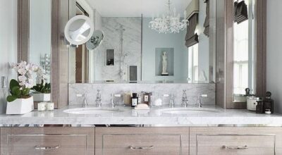 >Si eres amiga del lujo también puedes resarcir todas tus necesidades en tu cuarto de baño. Apuesta por paredes con murales de espejos ahumados vintage y una lámpara de araña. Si tienes espacio y te gusta, ¿por qué, no?
