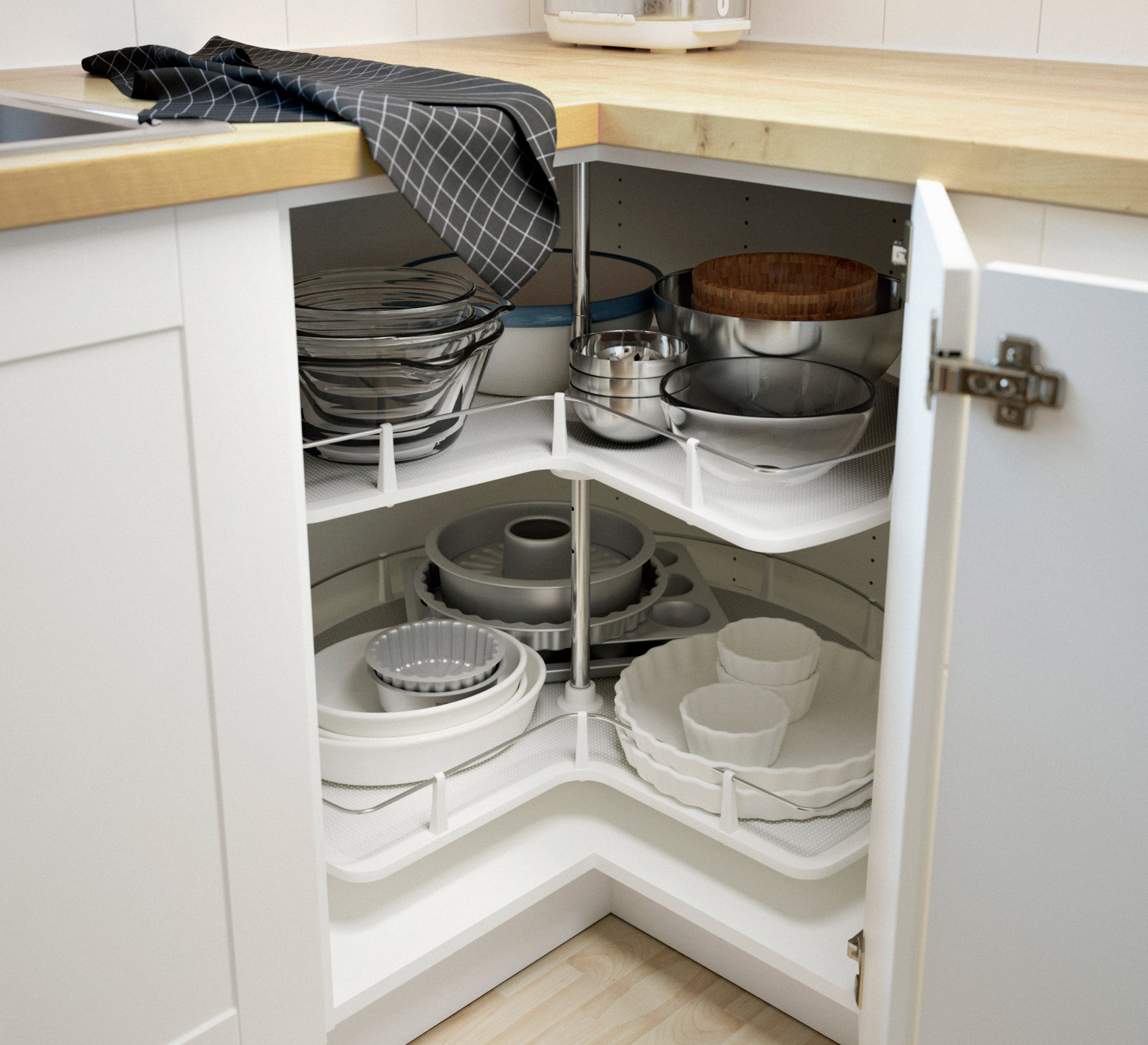 A la hora de escoger los muebles, si quieres que tu cocina quede despejada, ten en cuenta dos cosas: por un lado, elegir mobiliario de líneas rectas y sin salientes. Y, por otro, aprovechar las esquinas para instalar en ellas armarios que se adapten a nuestro espacio. En Ikea puedes encontrar este tipo de muebles que nos ofrecen soluciones muy prácticas. Entre ellos destacan aquellos armarios con dos baldas regulables que nos permiten mantener todo ordenado según nuestras necesidades. Además incluyen un carrusel giratorio perfecto para ver todo lo que tenemos y llegar a todo.