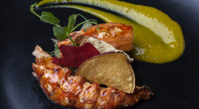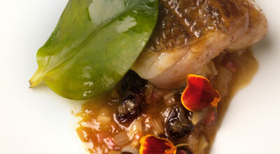 Besugo del Cantábrico al horno sobre chutney de ruibarbo y hoja de ostra